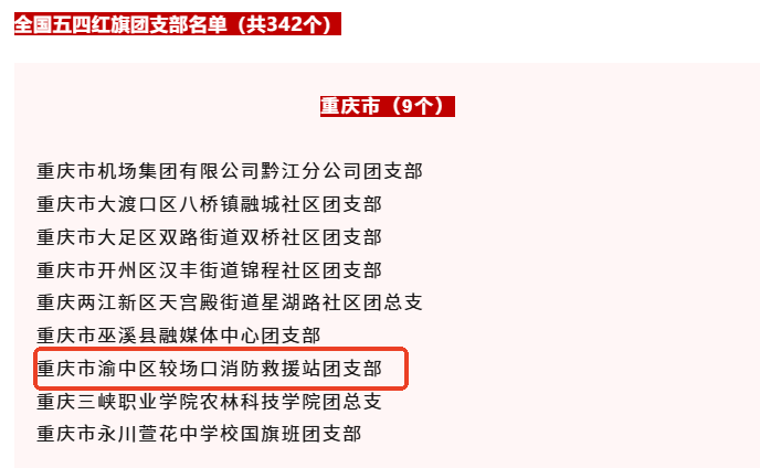 近日,共青团中央印发《关于表彰全国五四红旗团委(团支部)、全国优秀共青团员、全国优秀共青团干部的决定》。其中,渝中区较场口消防救援站团支部荣获“全国五四红旗团支部”称号,该称号是共青团中央授予基层团组织的最高荣誉。荣誉背后,是训练场上的挥汗如雨、火场逆行中的无畏冲锋、社区服务里的温情守护,更是以青春热血守护渝中万家灯火的忠诚与担当。