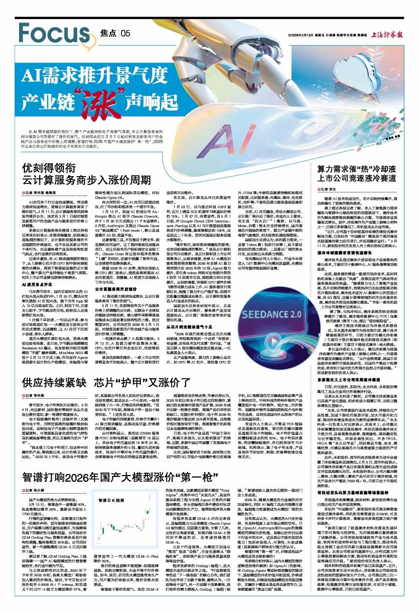 AI应用在千行百业快速落地,带动算力需求快速增长,使得云计算服务商有了涨价底气。2月11日,云计算服务商优刻得发布涨价公告,决定自3月1日起对续签及新签用户的全线产品与服务进行价格上浮调整。 多家云计算服务商在接受上海证券报记者采访时表示,在需求端爆发、供给端出现瓶颈的情况下,云计算租赁服务涨价不是短期的价格波动,也不会是某家公司的个体行为,而是意味着产业迎来结构性景气拐点,全行业涨价即将到来。 记者注意到,在AI需求超预期的情况下,从上游核心芯片的GPU到中游网络配套的光模块,再到下游基础设施的云计算中心,整个算力产业持续处于高景气周期,相关上市公司业绩也获得持续增长。 AI应用多点开花 马年春节前夕,国内互联网巨头的AI红包大战火热进行中。1月25日,腾讯元宝率先掀起AI红包大战,旗下元宝App投入10亿元现金红包。之后,阿里千问、百度文心助手、字节跳动的豆包,纷纷加入这场新春红包大战。 1分钱下单奶茶、一句话点外卖、参与即可抽奖送红包……大模型及互联网公司的花式营销,迅速圈粉,让AI应用下沉到小县城、老年人群体。 通用大模型忙着红包大战,垂类大模型也没有闲着。连日来,字节跳动视频模型Seedance 2.0爆火,网友纷纷开始用视频模型“手搓”趣味视频。MiniMax M2.5模型于2月12日正式上线,作为面向Agent场景原生设计的生产级模型,在编程与智能体性能方面比肩国际顶尖模型,对标Claude Opus 4.6。 在大洋的另一边,AI应用已经搅动硅谷,打了华尔街和程序员一个措手不及。 1月12日,美国AI初创公司Anthropic推出AI助手Claude Cowork,并于1月30日正式推出11个专业插件。2月初,Anthropic又推出Claude Opus 4.6“极速模式”(Fast mode),核心是速度提升2.5倍、质量不变。 这款智能工具,不仅能自主跨文件、浏览器和应用运行,让工程师高效完成复杂项目,还让非技术用户轻松搞定专业级工作。Claude Code在让硅谷程序员集体“上瘾”的同时,还顺手掀翻了软件行业,让全球软件股集体跳水。 展望2026年AI走势,英伟达创始人兼CEO黄仁勋表示,推理系统将推动AI走向更通用、更稳健,AI将更主动地嵌入工作与生活。 云计算服务商开启涨价 AI推动算力需求快速增长,让云计算服务商有了涨价的底气。 2月11日,优刻得发布关于产品服务价格上浮调整的公告称,近期由于全球供应链波动持续加剧,核心硬件采购等基础设施成本出现显著且结构性的上涨。经过慎重评估,公司决定自2026年3月1日起,对续签及新签用户的全线产品与服务进行价格上浮调整。 一纸涨价函点燃了A股算力板块。2月12日,A股算力硬件股集体大涨,CPO、光芯片等方向全面拉升,优刻得股价涨停。 谈及优刻得的涨价,一家上市公司的高管直言不讳地表示,整个云计算租赁行业即将开启涨价。 在北美,云计算龙头早已次第宣布涨价。 1月23日,亚马逊云科技AWS宣布,近日上调其EC2机器学习容量块价格约15%。1月27日,谷歌宣布,自5月1日起,对Google Cloud、CDN Interconnect、Peering以及AI与计算基础设施服务进行价格调整,最高涨幅达到100%,这是其近二十年来,首次对基础云服务实施大幅涨价。 “涨价背后,既有需求端爆发的影响,也有供给端瓶颈的掣肘。”谈及云计算租赁公司开启涨价,某云计算租赁上市公司高管表示,从需求端看,全球AI大模型训练和推理需求激增,2026年全球AI算力需求预计达2025年的10倍;Agent能力提升,单任务token消耗可达传统问答的4倍至15倍甚至百倍,推理算力单位价值提升。从供给端看,存储和GPU硬件价格飞涨带动算力成本上升、AI服务器交付周期拉长,拖慢了算力中心产能扩张。供需不匹配叠加能源成本高企,云计算租赁服务进入行业成长的拐点。 国联民生证券在研报中表示,北美云计算龙头开启涨价,意味着产业迎来重要拐点,云计算厂商涨价或带来价值重估机遇。 从芯片到光模块景气十足 “2026年我们依然会重点关注光模块领域,你很难再找到一个这样‘有需求、有业绩,还有技术迭代支撑’的行业。”谈及近期A股光模块概念股反复走强,一位私募基金人士表示。 从产业链角度,算力的上游核心是芯片,如GPU等AI芯片、高性能CPU芯片、HBM等;中游则是数据传输和网络相关配套,比如服务器、光模块、液冷、光交换机、光纤等;下游则是算力服务基础设施和算力应用。 当前,AI应用爆发,带动大模型公司、云计算厂商开启了涨价。在业内人士看来,在北美“四大云厂”(微软、亚马逊、Meta、谷歌)资本开支持续增长、国内高端芯片短缺的背景下,算力产业链中游的高景气度确定,相关投资机遇值得重视。 国联民生证券认为,研判算力需求,一是看Token数(包括日活等),其主要反映实时的算力需求;二是看云厂商的资本开支,这反映出未来算力预期。 有光模块公司人士表示,行业今年将进入1.6T数据中心光模块放量期,光模块公司有望持续延续好业绩。