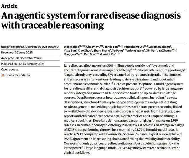 2月19日凌晨,上海交通大学医学院附属新华医院孙锟教授、余永国教授领衔团队与上海交通大学张娅教授、谢伟迪副教授领衔团队联合研发出一款能看罕见病的人工智能系统,相关成果北京时间2月19日在国际顶尖期刊《自然》上发表。这套名为DeepRare的系统,被称作全球首个“推理过程可追溯”的罕见病智能医生。